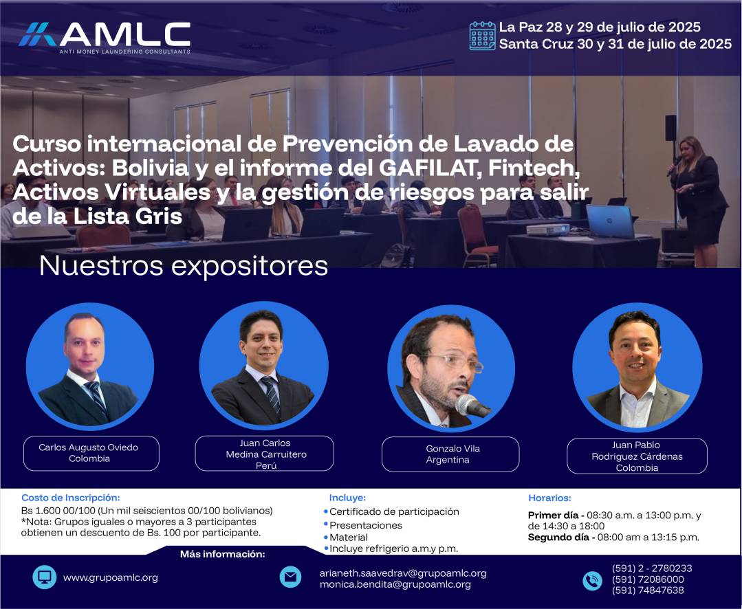Esta capacitación busca brindar herramientas prácticas y actualizadas para abordar los retos que enfrenta Bolivia frente al informe del GAFILAT, el crecimiento de las Fintech, el uso de activos virtuales y la necesidad de fortalecer la gestión de riesgos con miras a la salida de la Lista Gris.
